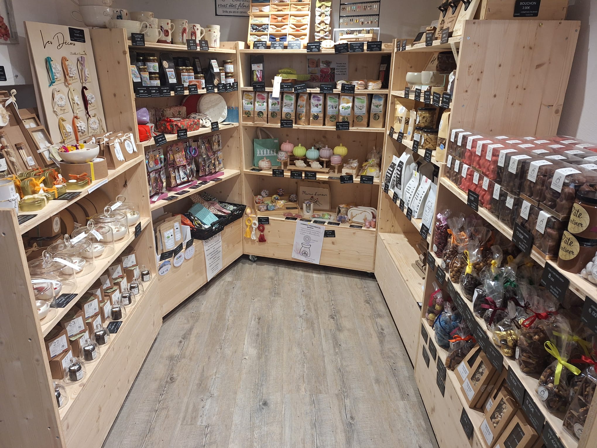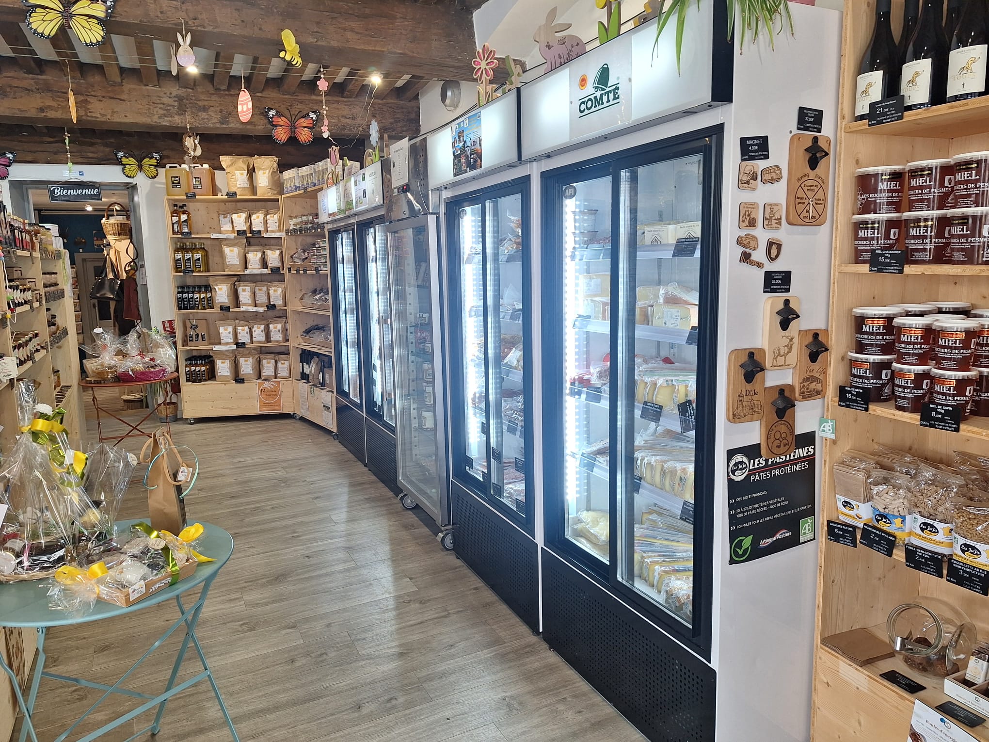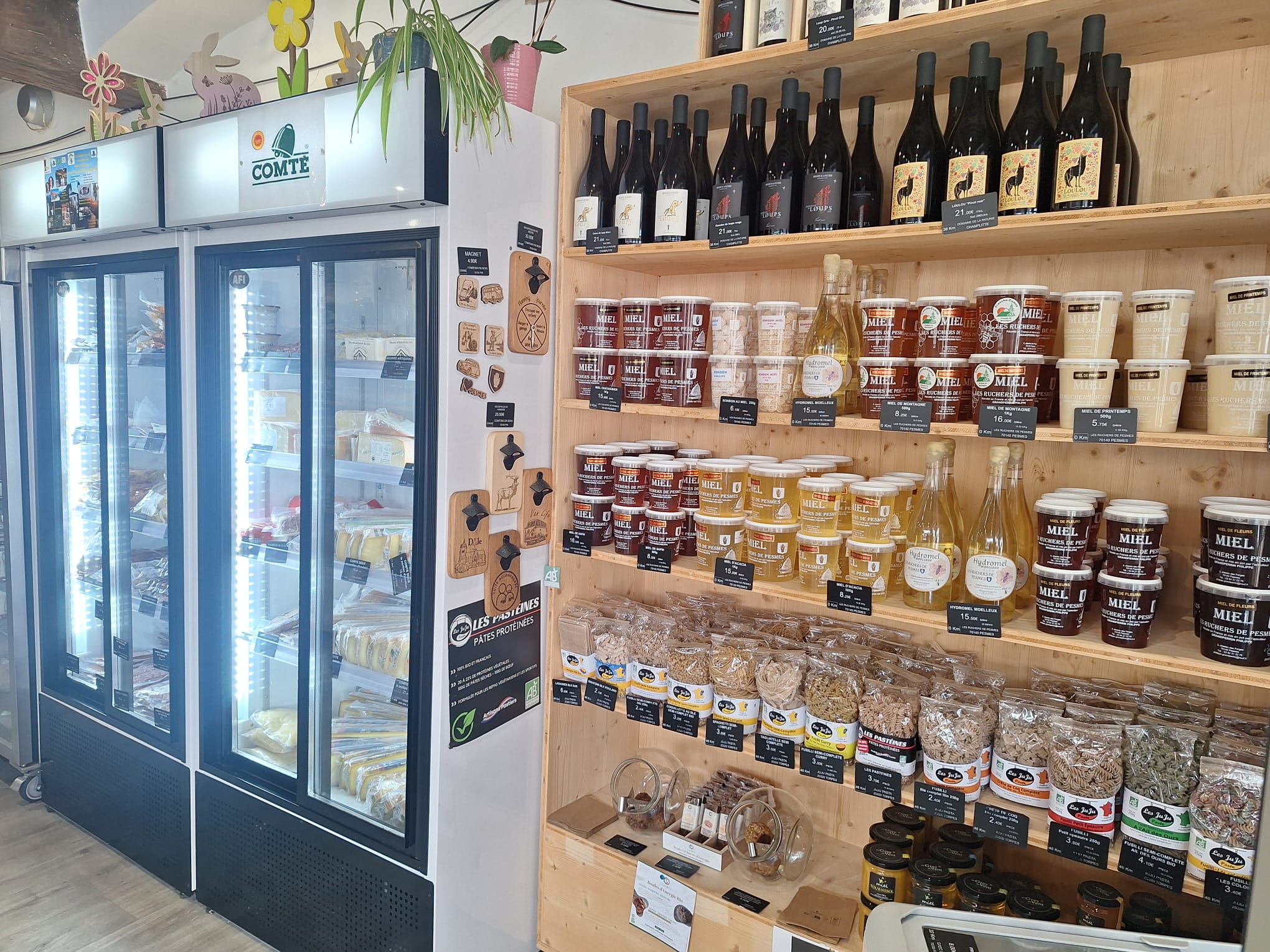 Le magasin tout habillé de bois est tenu par trois vendeuses en alternance. Vous y trouverez les produits de la coopérative (Comté, Morbier, beurre, crème, sérac, lait cru) et des produits locaux et régionaux (Bleu de Gex, fromages de chèvre, Mont d'or, cancoillotte et metton, yaourts, miel, vin d'Offlanges et Côtes du Jura, jus de pommes...