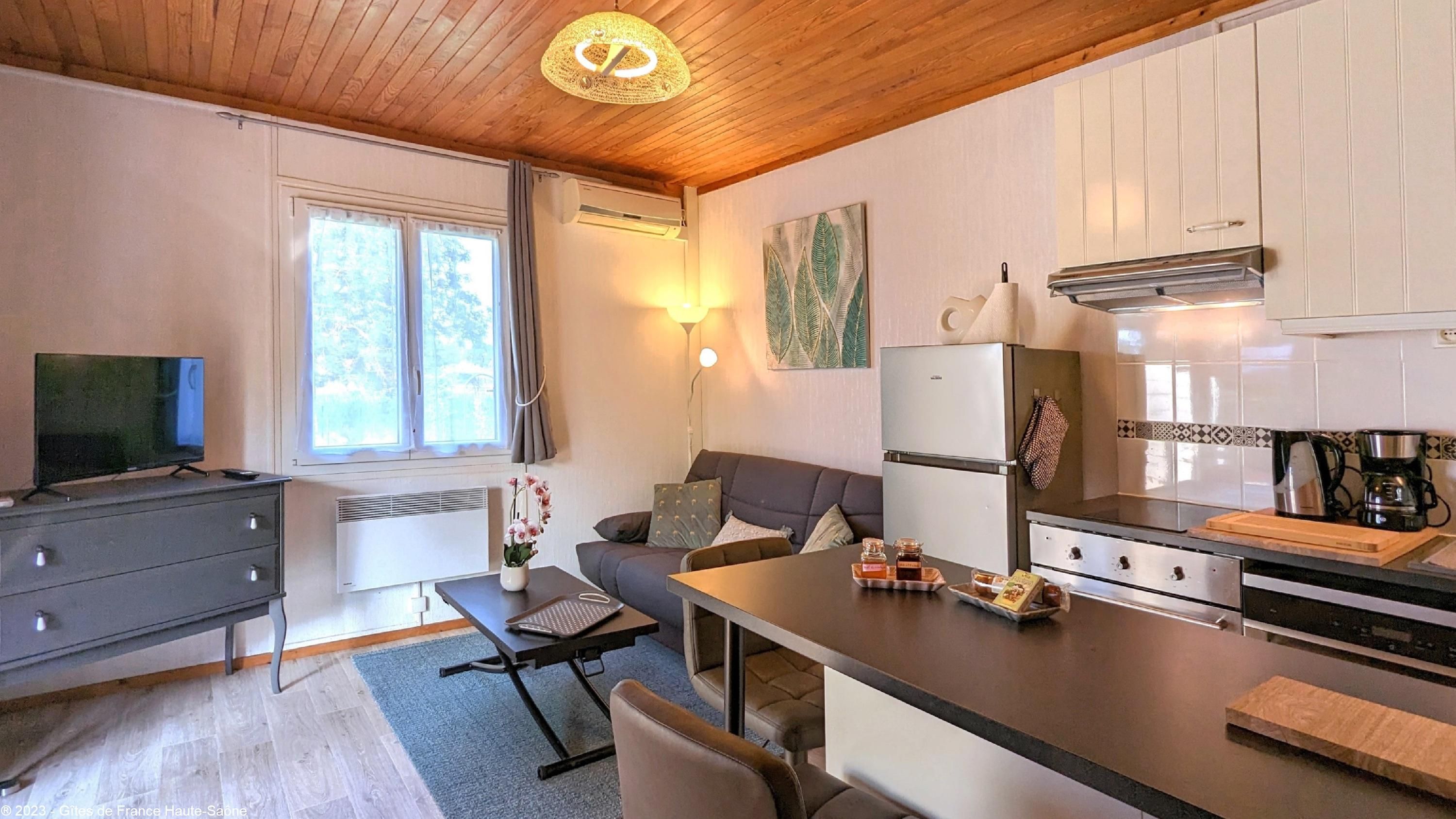 The 42m² chalet comprises a kitchen opening onto the living room with a table/bar or coffee table that can be raised for meals. Television in the living room. Bathroom with shower and WC. Bedroom with double bed (160 x 200cm) and second television. The chalet can be air-conditioned, although it is naturally well insulated. Private terrace with garden furniture and sun loungers. A cot and high chair are available on request. A barbecue is available. Ideal for many walks. Enclosed private car park.