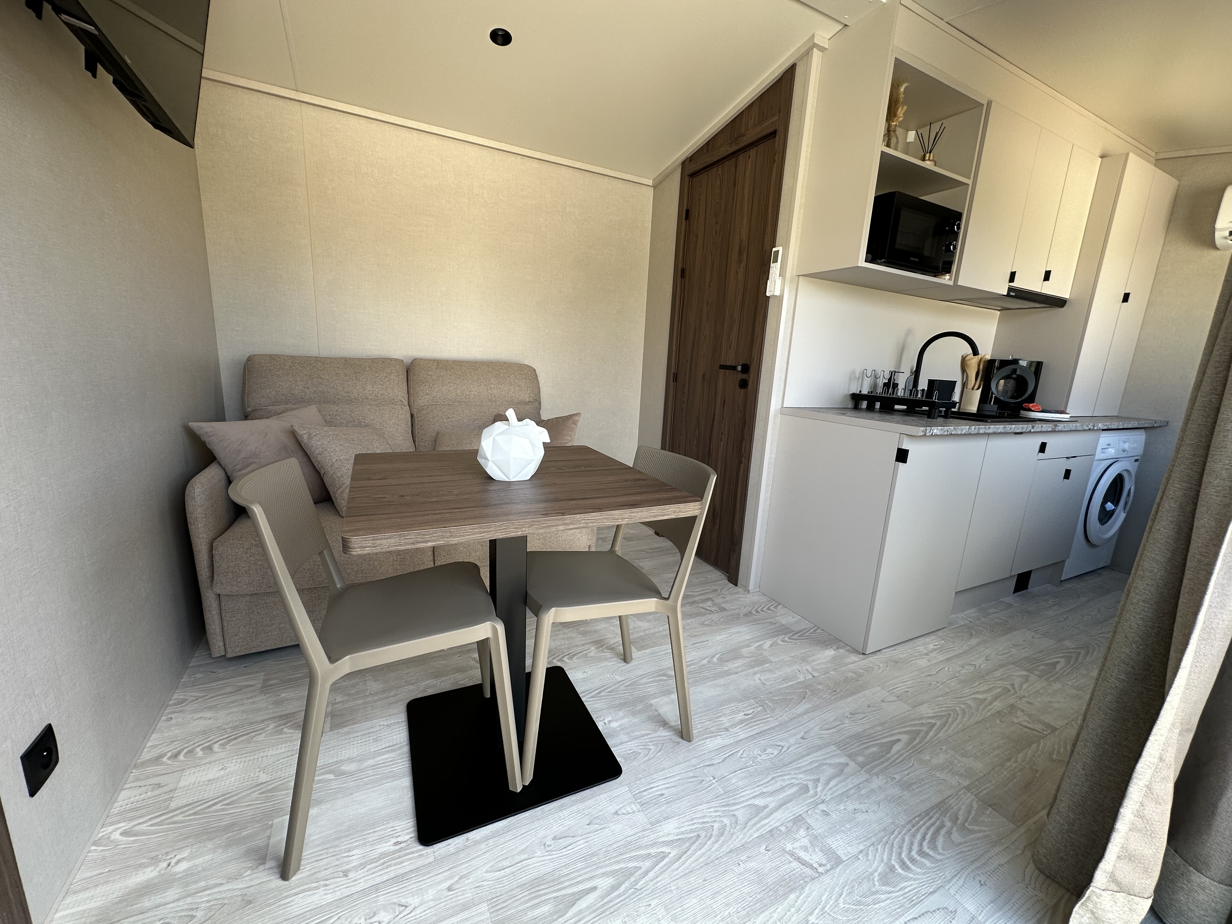 De chalet van 42 m² bestaat uit een keuken die uitgeeft op de woonkamer met een tafel/bar of salontafel die kan worden opgetild voor de maaltijden. Televisie in de woonkamer. Badkamer met douche en WC. Slaapkamer met tweepersoonsbed (160 x 200cm) en tweede televisie. Het chalet kan worden voorzien van airconditioning, hoewel het natuurlijk goed geïsoleerd is. Privé-terras met tuinmeubelen en ligstoelen. Een kinderbedje en kinderstoel zijn beschikbaar op aanvraag. Een barbecue is beschikbaar. Ideaal voor vele wandelingen. Afgesloten privé parkeerplaats.