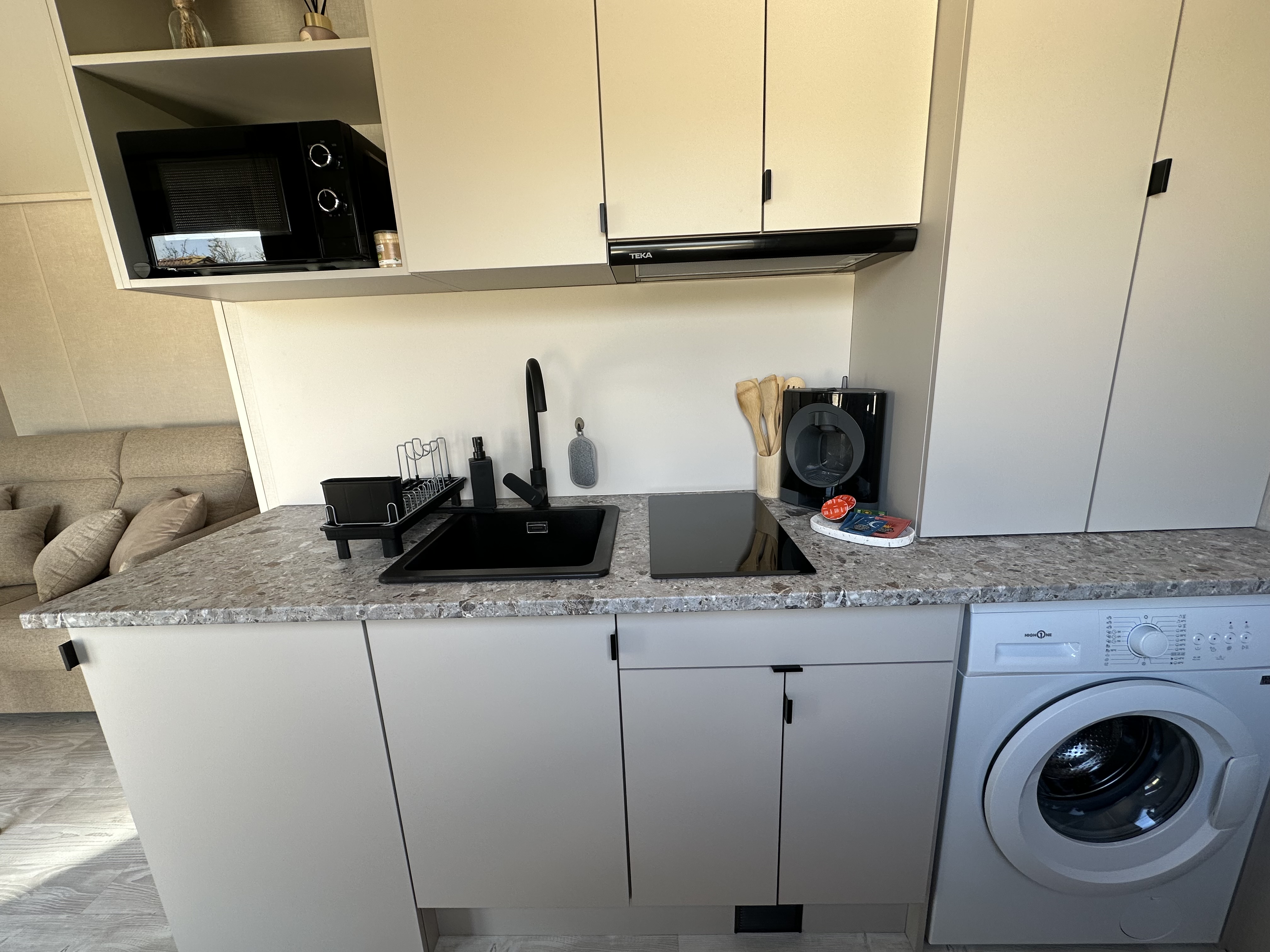 Gelegen op hetzelfde terrein als het huis van de eigenaren, heb je je eigen groene privéruimte en onafhankelijke, omheinde toegang met de auto. De begroeiing en het privacyscherm zorgen ervoor dat je verblijf zo privé mogelijk is.